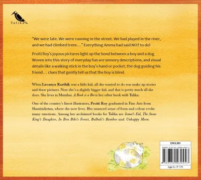"We were late. We were running in the street. We had played in the river, and we had climbed trees...” Everything Amma had said NOT to do! Proiti Roy’s joyous pictures light up the bond between a boy and a dog. Woven into this story of everyday fun are sensory descriptions, and visual details like a walking stick in the boy’s hand or pocket, the dog guiding his friend... clues that gently tell us that the boy is blind.