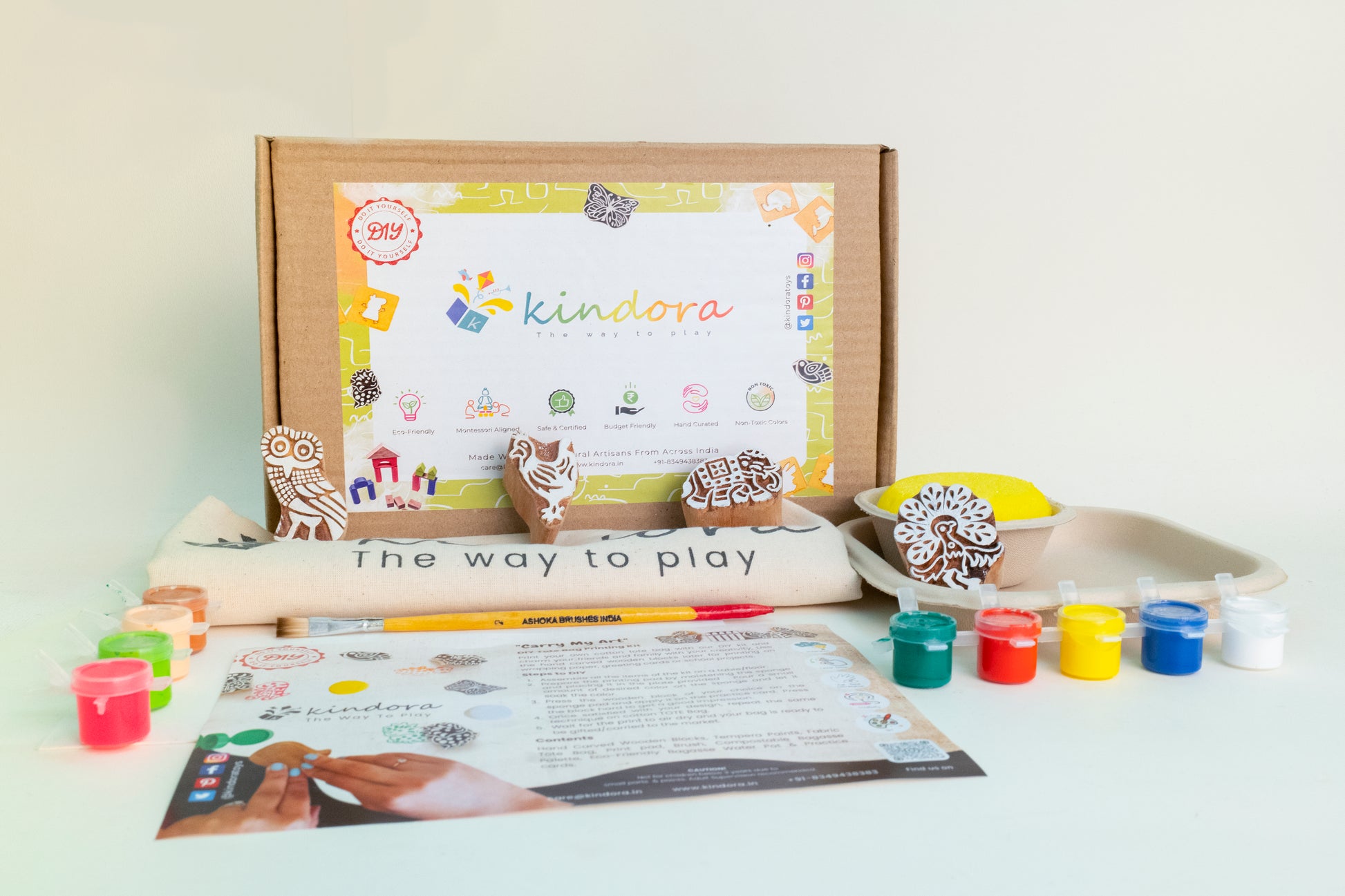 Kindora presents a very fun, creative and informative DIY (Do-It-Yourself) activity kit called “Animal World Wooden Block Printing Kit”. This kit uses age old technique of block printing on fabrics as its main concept and contains 4 blocks of animals, i.e., Elephant, Peacock, Owl and Hen to create interactive and colourful patterns on the tote bag.