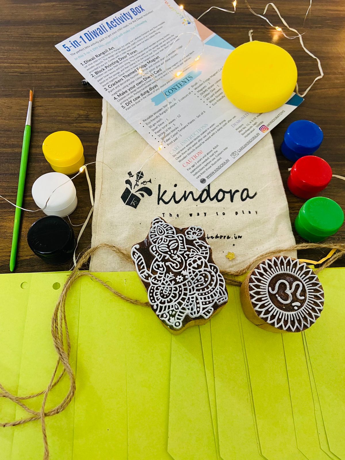 Let your curious little one create a beautiful toran (a door garland) with a kit of pre-cut paper leaves and wooden block printing stamps.