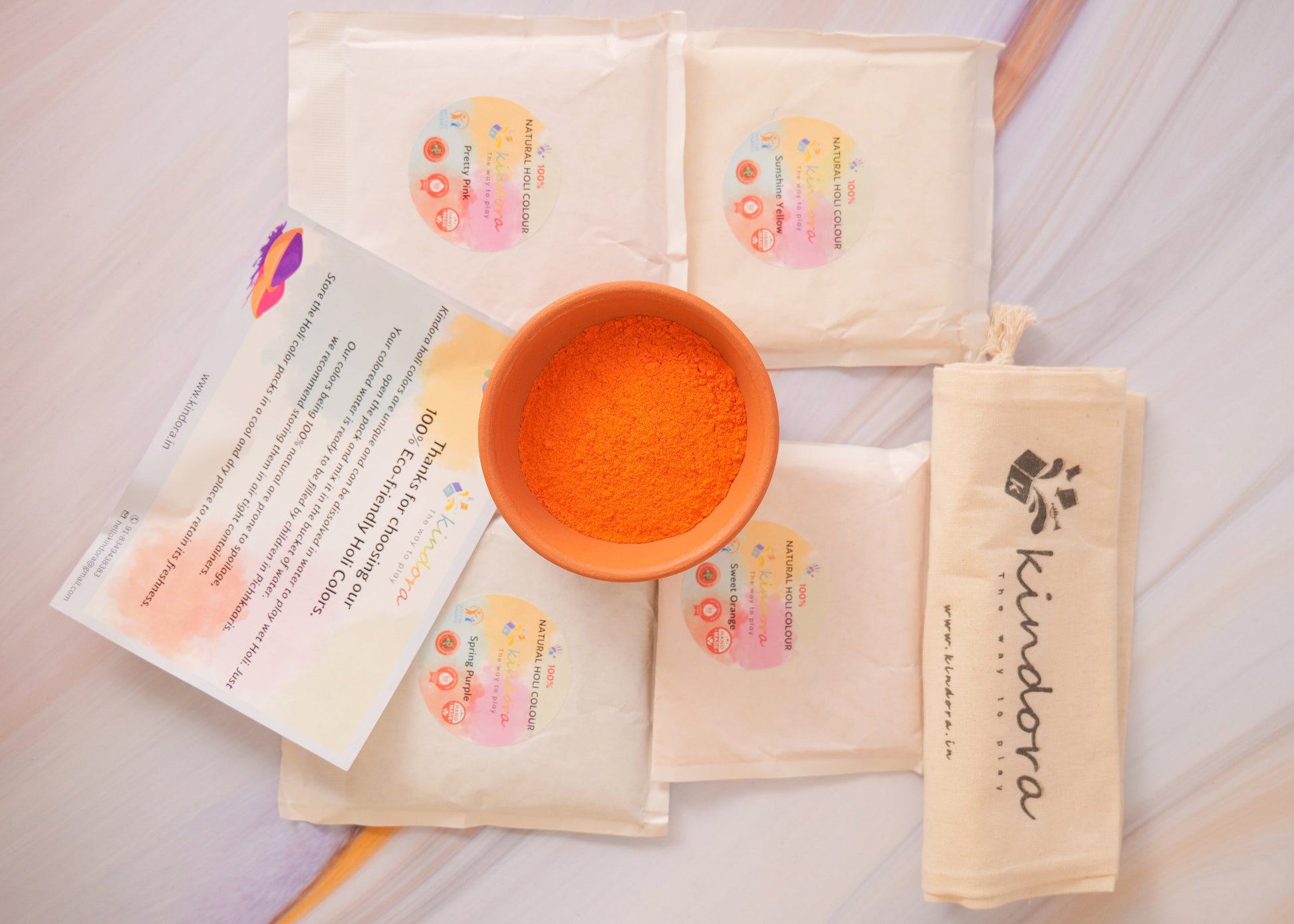Kindora's handmade Holi colours are completely risk-free and beneficial! In the lab, our colours were found to be free of heavy metals and artificial dyes. The recipe contains no talc, artificial colours, or chemicals. They are non-toxic, non-irritating to the skin and suitable for children too. We have yellow, green, blue and orange colours in powder form which can be diluted with water to play wet Holi.