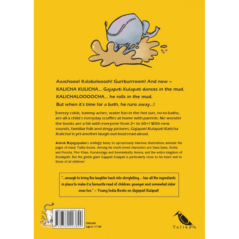 KALICHA KULICHA… Gajapati Kulapati dances in the mud. KALICHAKLOOOOCHA… he rolls in the mud. But when it’s time for a bath, he runs away…! With new sounds, familiar folk and zingy pictures, this is yet another laugh-out-loud read-aloud featuring the adorable elephant of the runaway hit series.