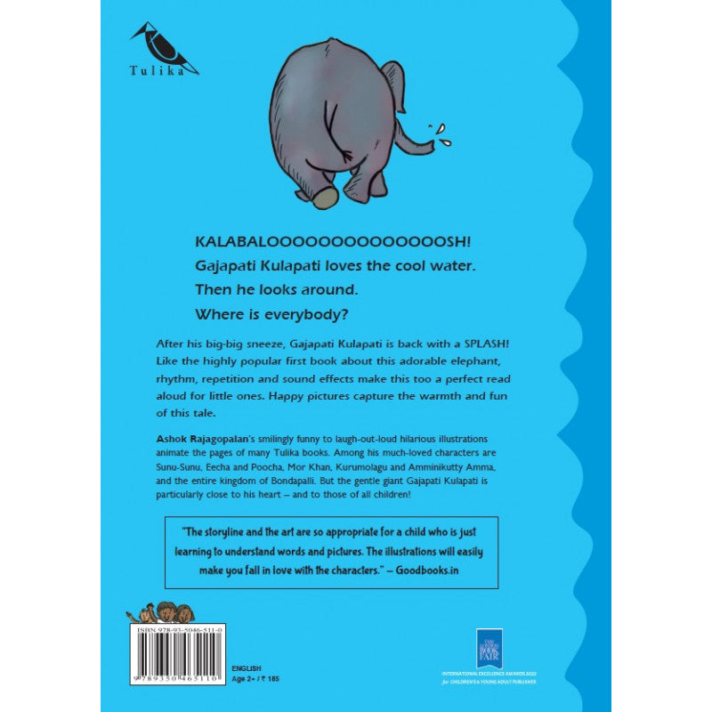 After his big-big sneeze, Gajapati Kulapati is back with a SPLASH! Like the highly popular first book about this adorable elephant, rhythm, repetition and sound effects make this too a perfect read aloud for little ones. Happy illustrations capture the warmth and fun of this tale.
