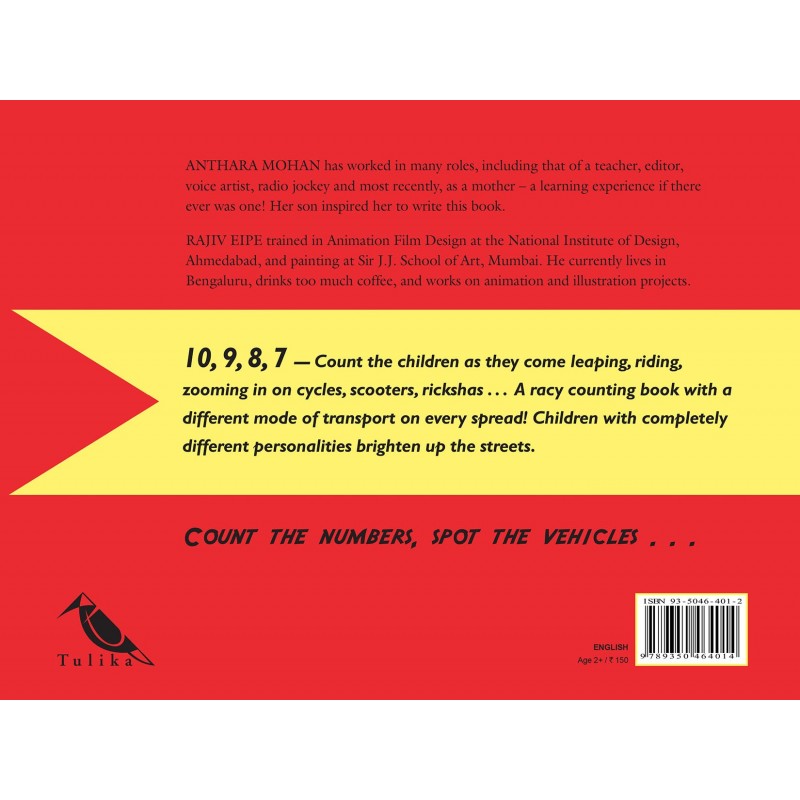 10, 9, 8, 7 – count the children as they come leaping, riding, zooming in on cycles, scooters, rickshas… A racy counting book with a different mode of transport on every spread! Children with completely different personalities brighten up the streets.