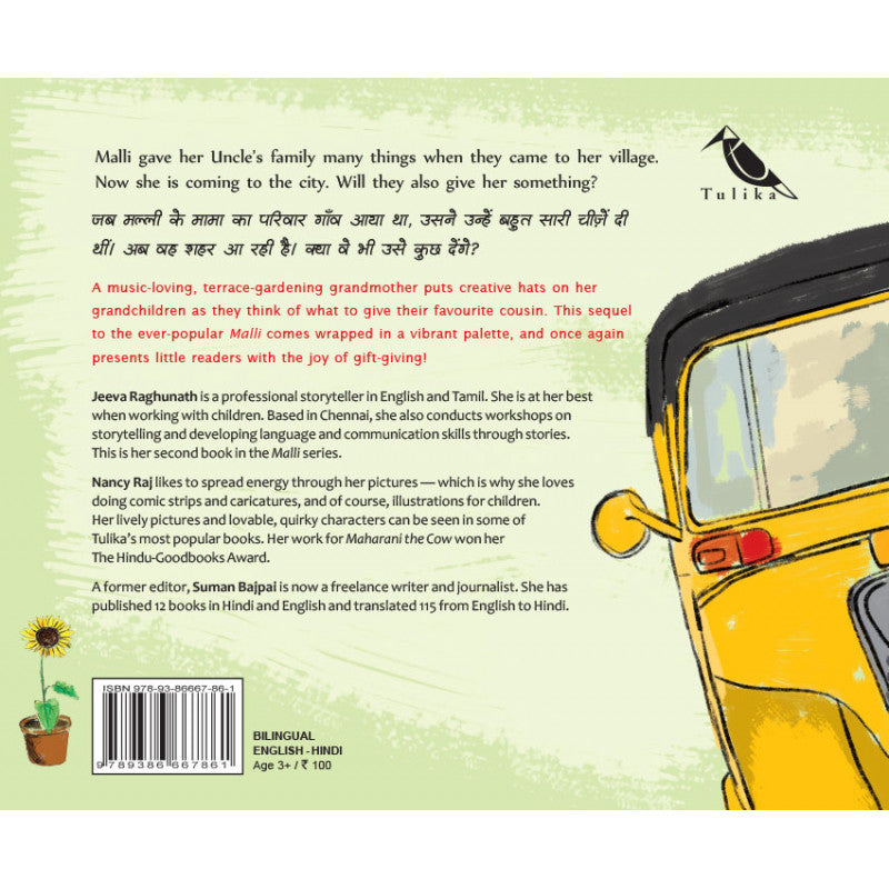 Malli gave her uncle’s family many things when they came to her village. Now, she is coming to the city. Will they also give her something? A music-loving, terrace-gardening grandmother puts creative hats on her grandchildren as they think of what to give their favourite cousin. This sequel to the ever-popular Malli comes wrapped in a vibrant palette, and once again presents little readers with the joy of gift-giving!