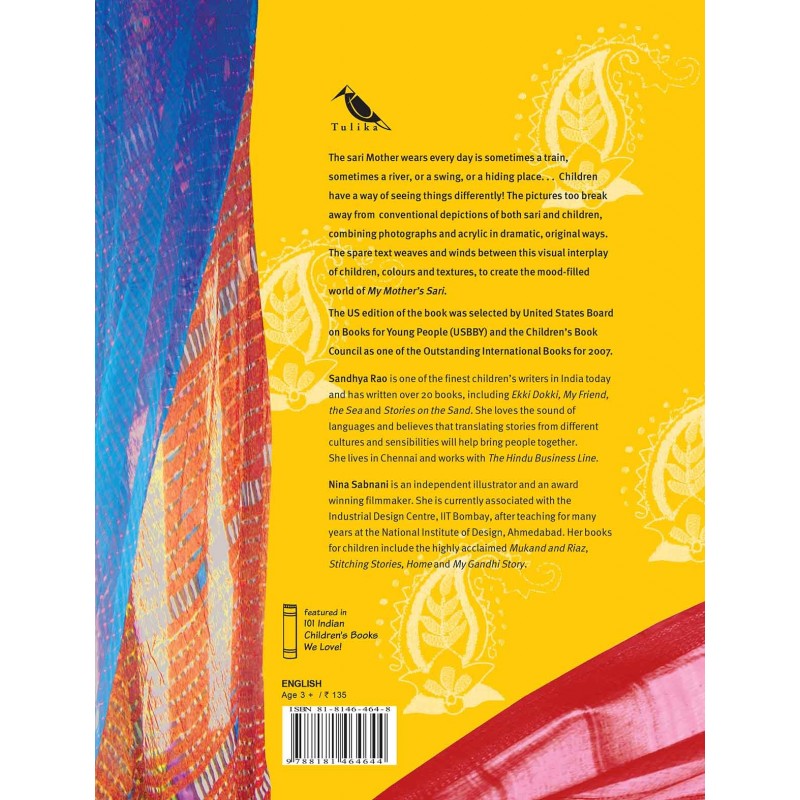 The sari Mother wears every day is sometimes a train, sometimes a river, or a swing, or a hiding place… Children have a way of seeing things differently! The pictures too break away from conventional depictions of both saris and children, combining photographs and acrylic in dramatic, original ways, with spare text that weaves and winds.