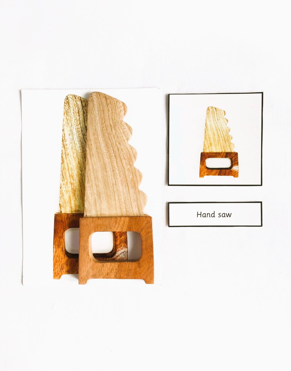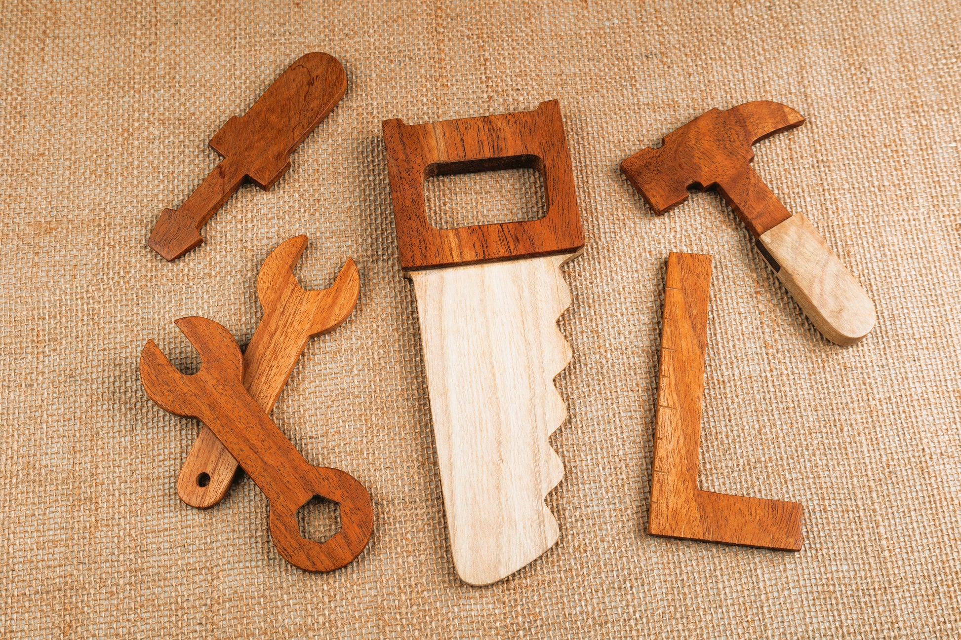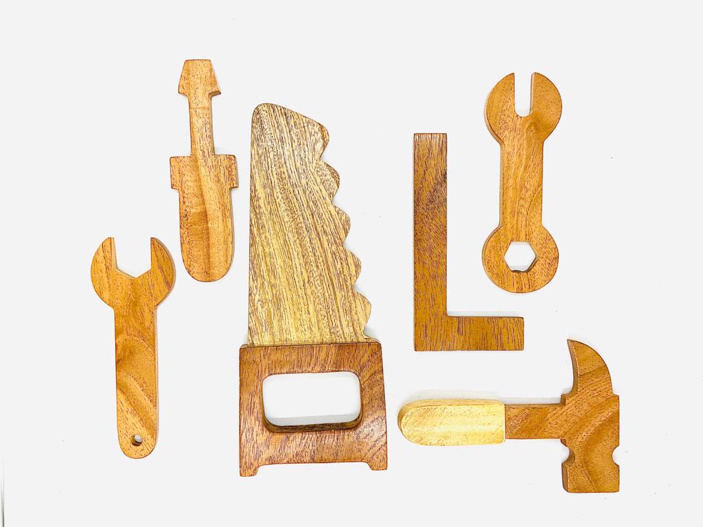6 X Child sized wooden tools (a wooden hammer, a handsaw, a wrench, a spanner, a screwdriver and L-angled ruler)