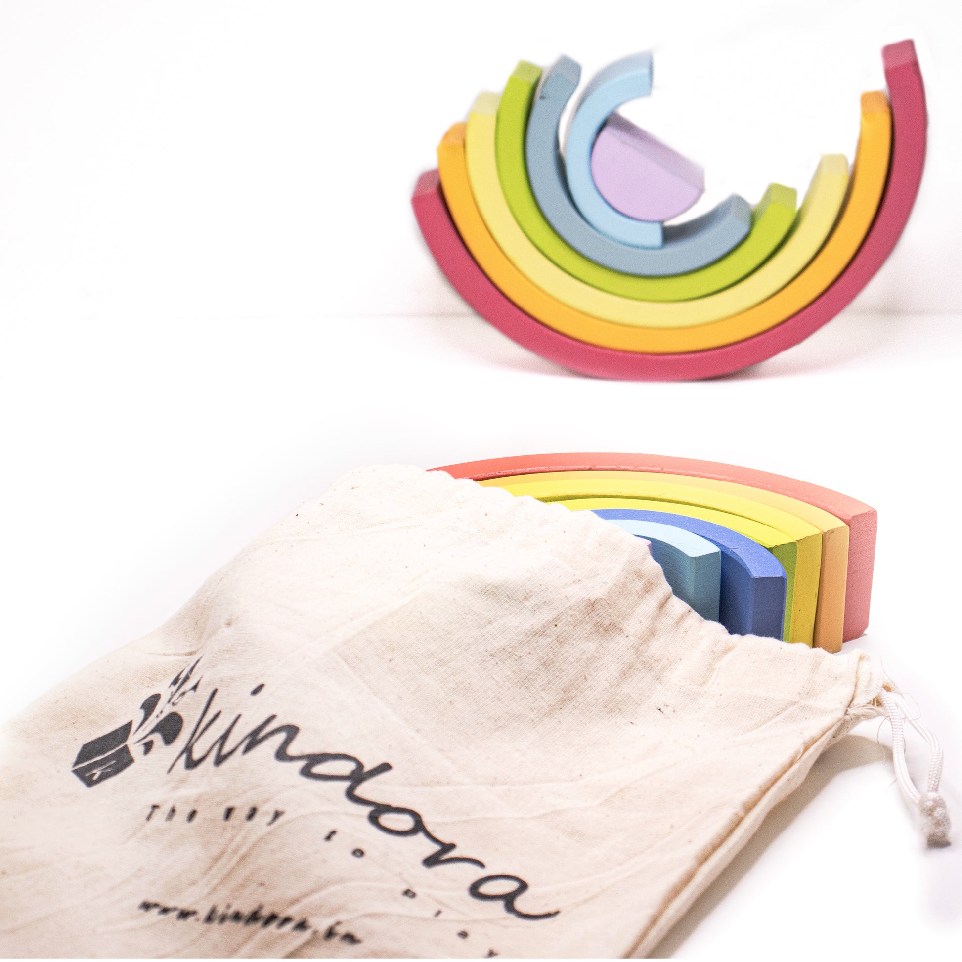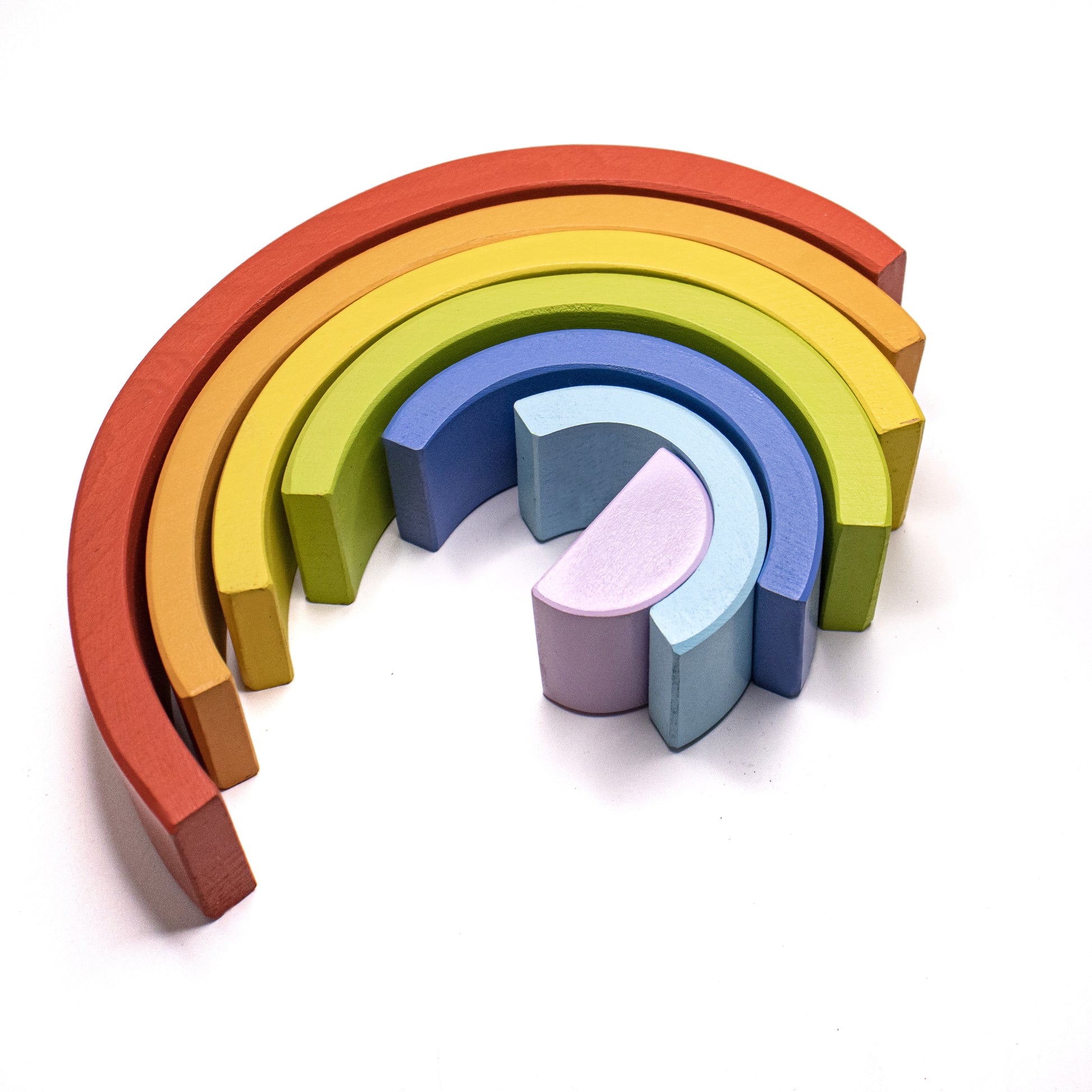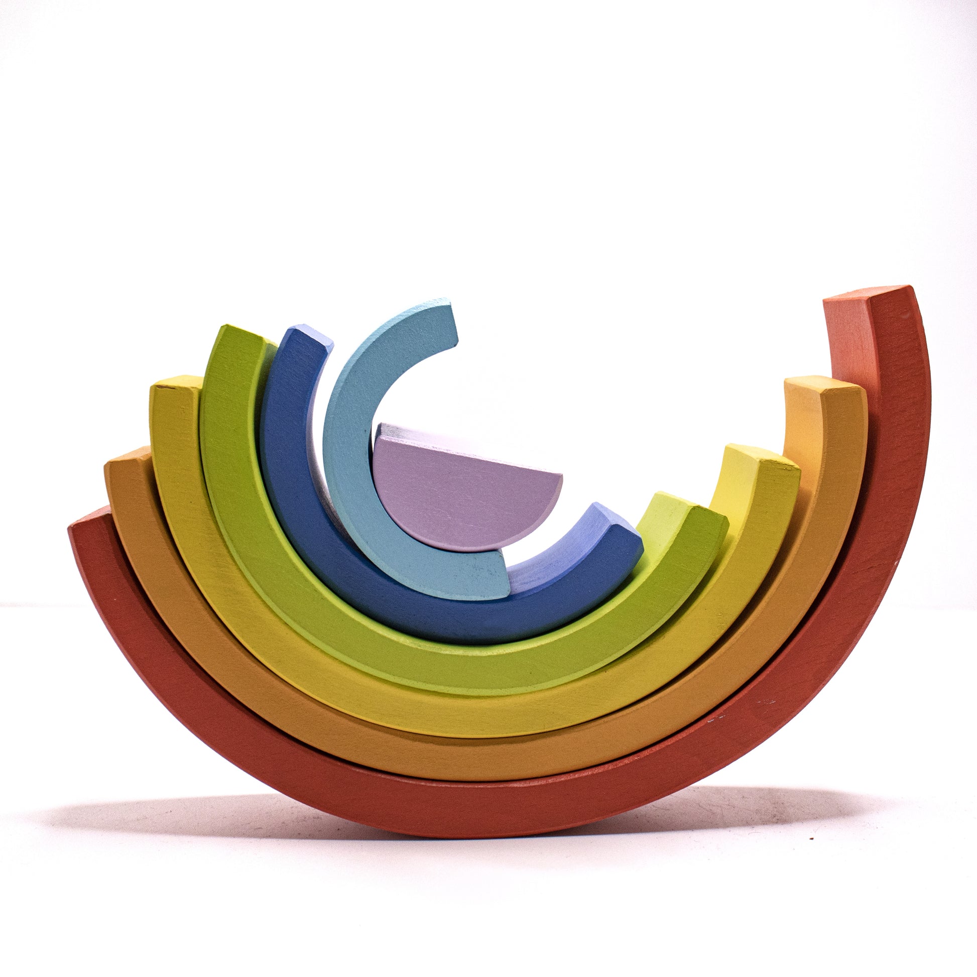 Stack these tunnel pieces together to make a real rainbow! A great first puzzle for your toddler to develop their matching skills, size and color recognition.
