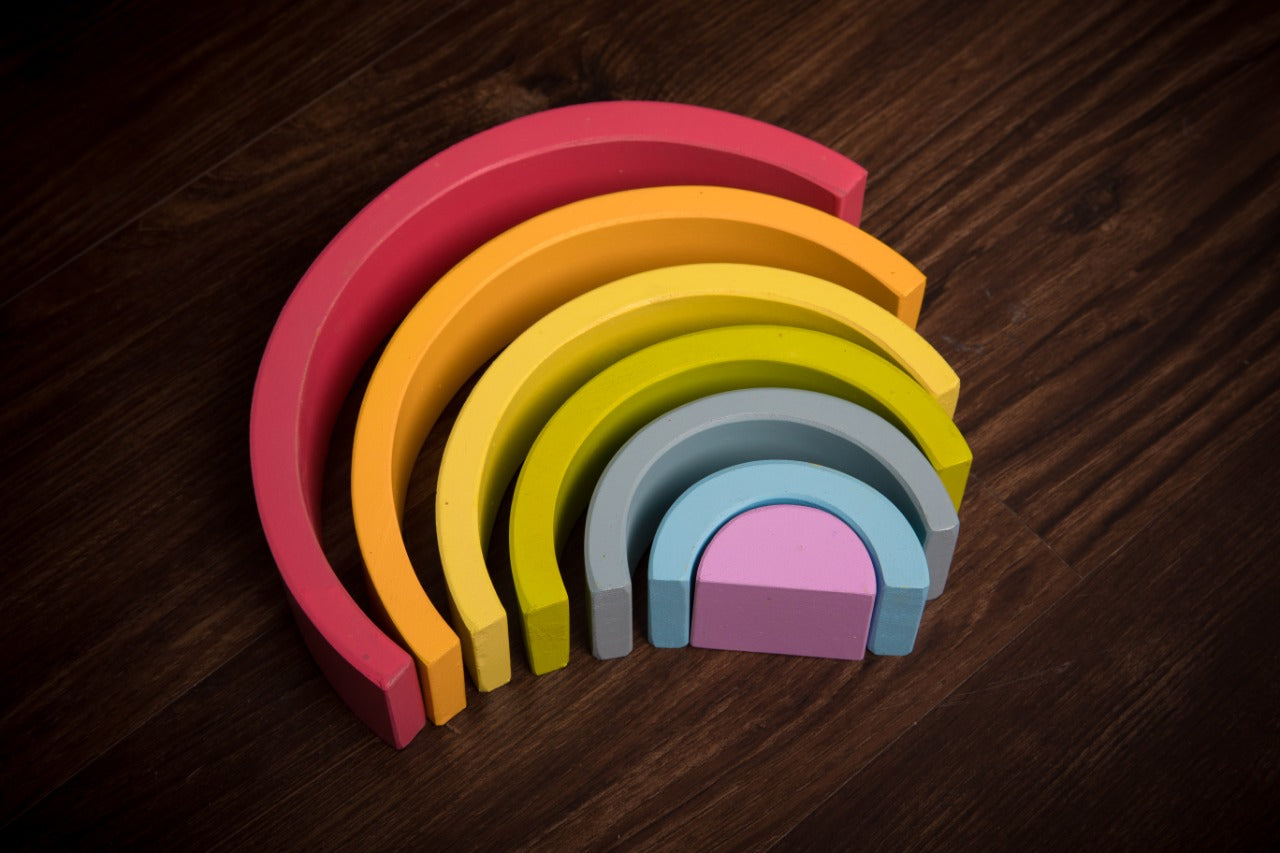 Stack these tunnel pieces together to make a real rainbow! A great first puzzle for your toddler to develop their matching skills, size and color recognition.