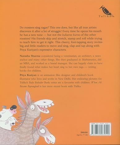 Do roosters sing ragas? This one does, but like all true artistes gets to it after a lot of struggle! Every time he opens his mouth he sings a new tune but not the kukaroo-kuroo of the other roosters. His friends skip and stretch, stamp and roll and try to teach him. Try as he might our rooster kuka-moooooos, kuka-heeen haaans, kuka-miaooows but can't kukaroo-kuroo. This cheery, foot-tapping story invites big and little readers to move and sing, clap and tap along with Priya Kuriyan's expressive characters.