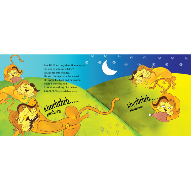 Shanmugam the lion is supposed to be the king of the jungle but all he does is sleep. Worse, he snores. Then one day, another lion enters the jungle. He is lean and mean — he is Gabbar Singh. The other animals are frightened, but how can they get the lazy Shanmugam to awake to their defence?
