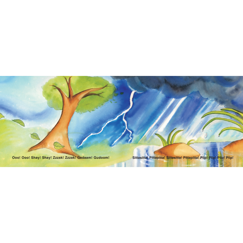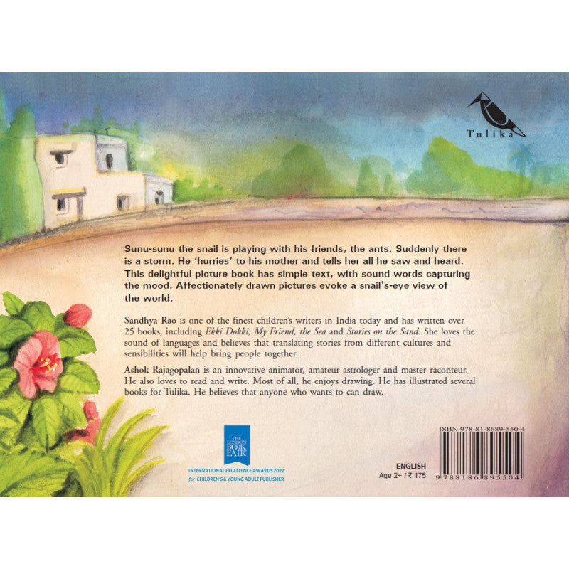Sunu-sunu the snail is playing with his friends, the ants. Suddenly there is a storm. He ‘hurries' home to his mother and tells her all he saw and heard. With repetitive sound words creating the mood, eloquent illustrations evoke a snail's-eye view of the storm in his world – the garden!